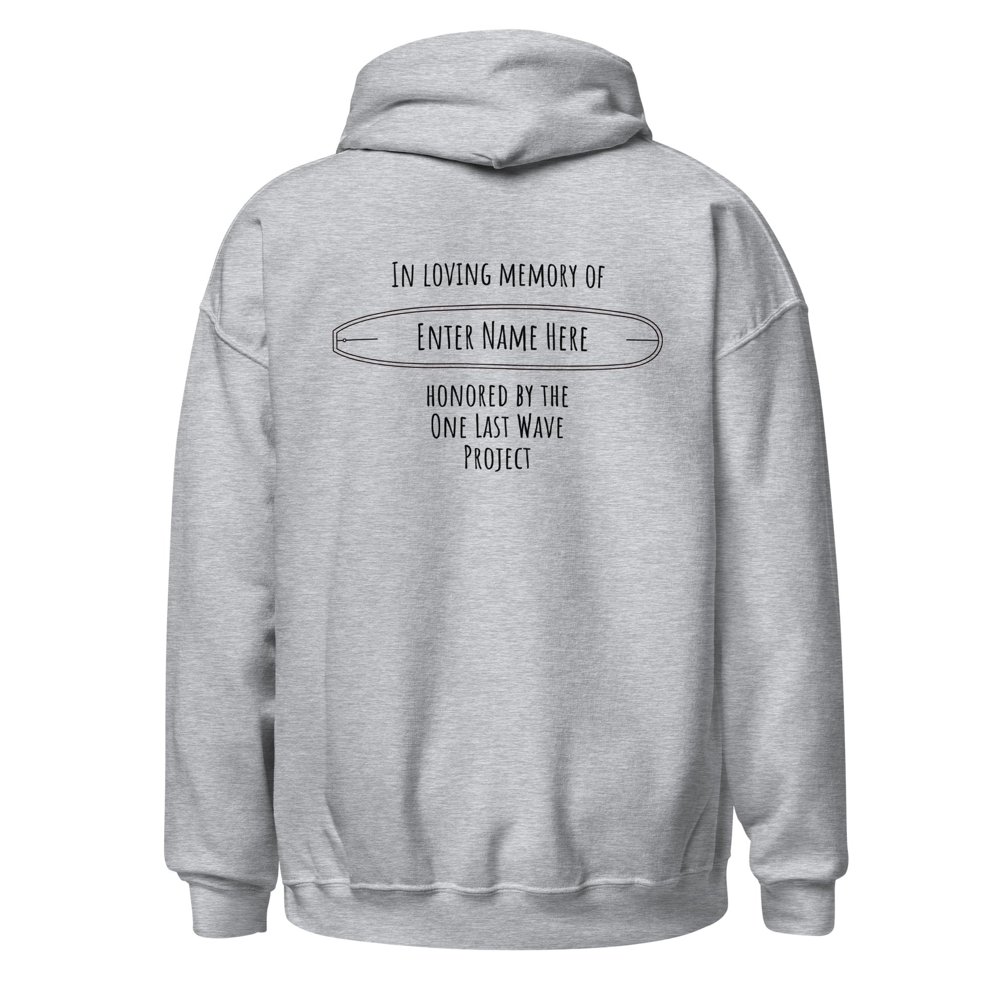 Now personalizable! Match your support for the OLWP with this comfy and cozy embroidered OG hoodie. A soft classic featuring a vibrant embroidered OLWP logo on the left chest and your personalized loved ones name on the back. It'll keep you warm by the cool sea breeze while honoring their love of the ocean.