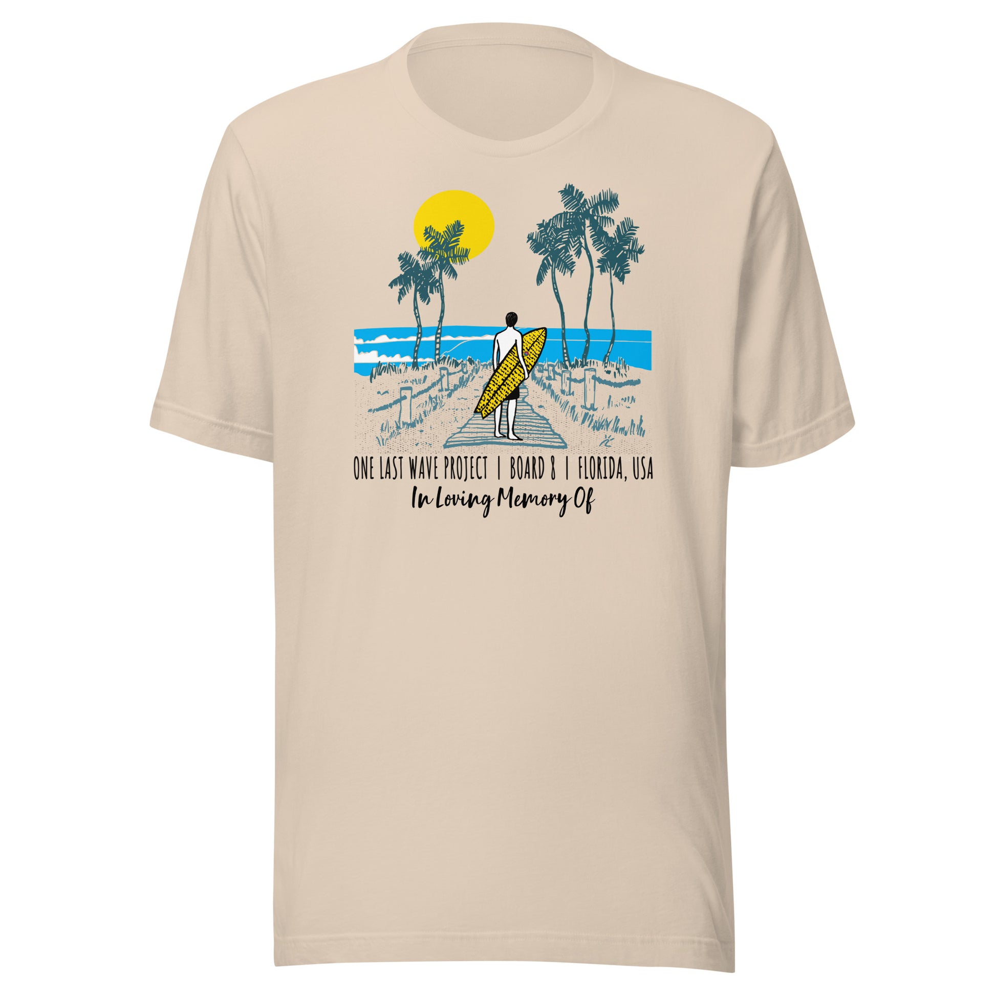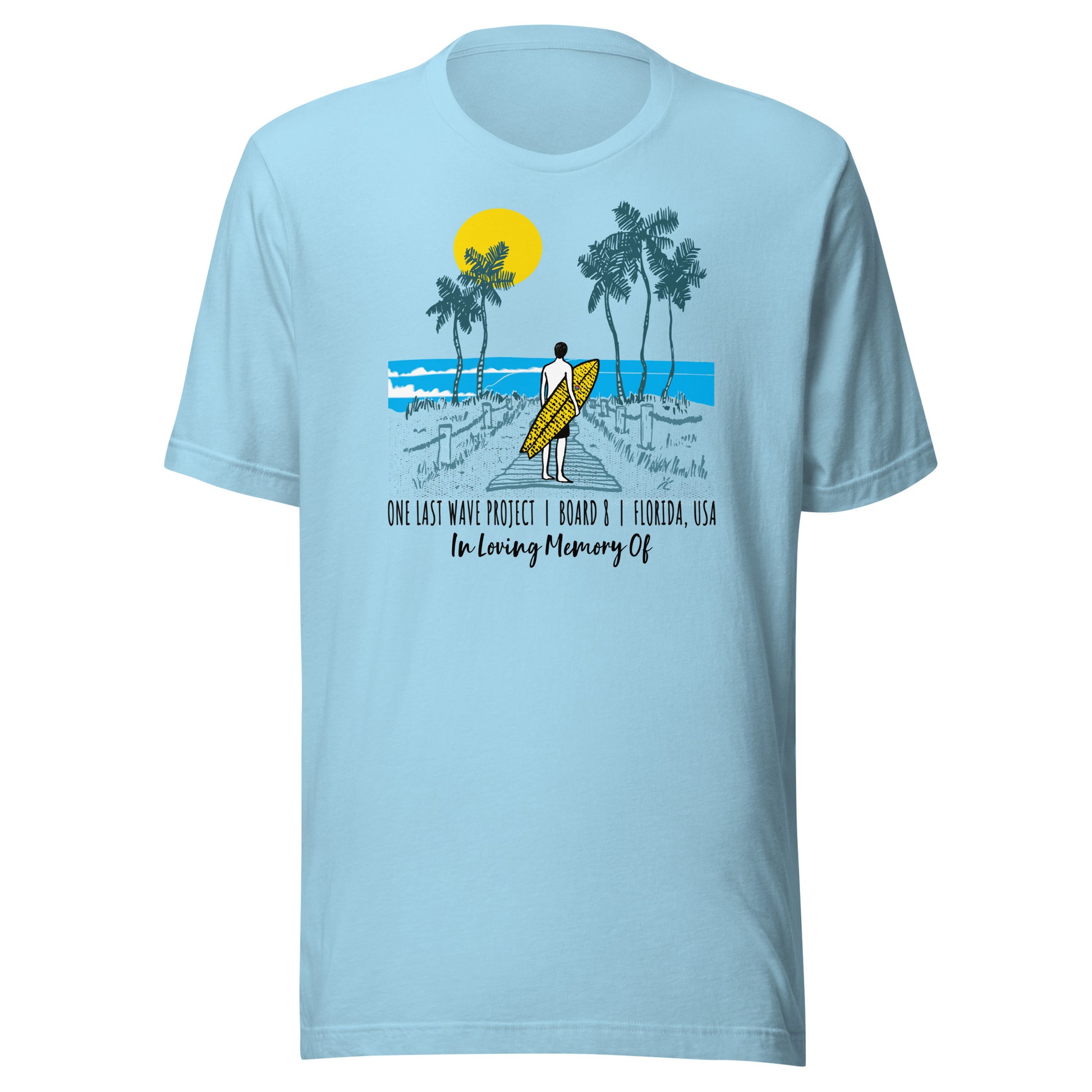 Now personalizable! This super soft, breathable tee featuring Board #8 on the beach in Florida, USA was designed by renowned artist Raul Casado. Inspired by a love of the ocean, surfing and the One Last Wave Project, this tee honors the lives of all those on board eight.