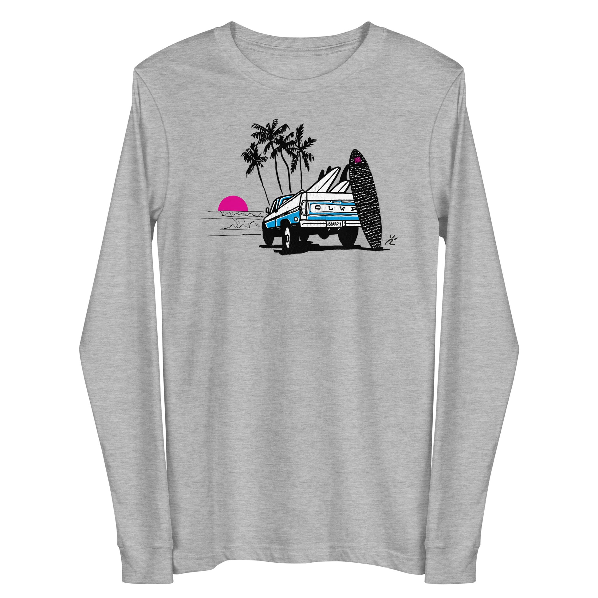 This super soft, lightweight, OLWP unisex long-sleeve tee featuring Board #1 was designed by renowned artist Raul Casado. Inspired by a love of the ocean, surfing and the One Last Wave Project this tee commemorates our first anniversary and honors the lives of all those on board one.