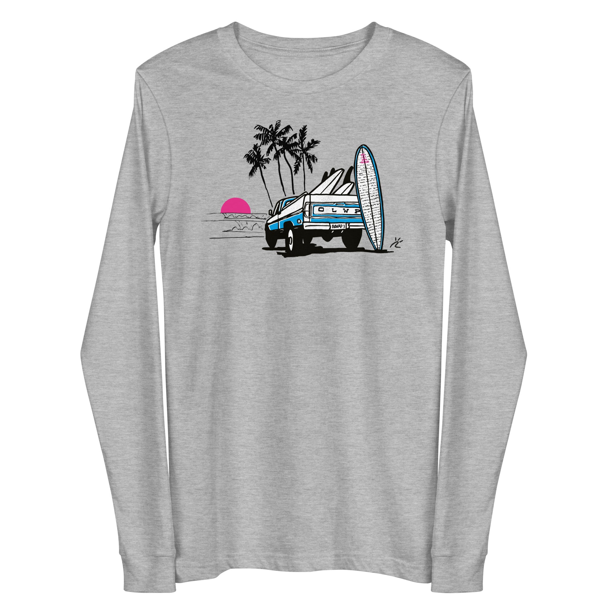 This super soft, lightweight, OLWP unisex long-sleeve tee featuring Board #3 was designed by renowned artist Raul Casado. Inspired by a love of the ocean, surfing and the One Last Wave Project this tee commemorates our first anniversary and honors the lives of all those on board three.