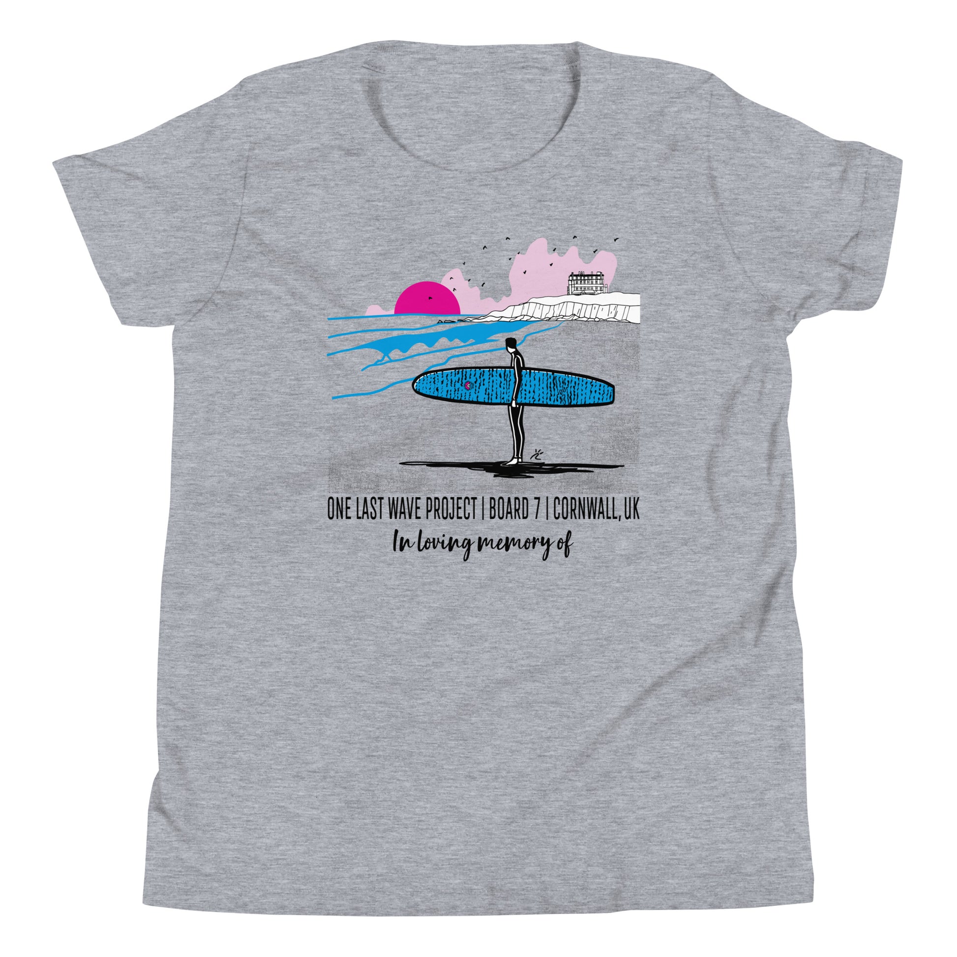 Now personalizable! Our 100% ring-spun combed cotton, classic youth jersey OLWP t-shirt is soft, comfy, and featuring Board #7 at Fistral beach in Cornwall, UK was designed by renowned artist Raul Casado. Inspired by a love of the ocean, surfing and the One Last Wave Project, this tee honors the lives of all those on board seven.